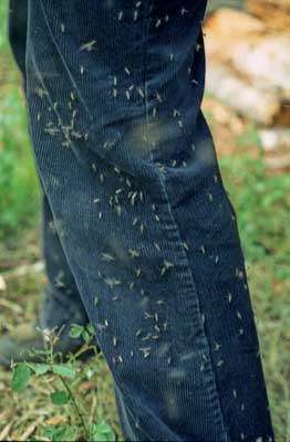 Around the second week in June, the new crop rises up out of the swamp. These are fast, they land beak first. The rest of June and July they go at you full bore. Usually they taper off in August and are gone by mid-September. There are good mosquito years and there are bad mosquito years. Good mosquito years tend to be dry and smoky. The less said about bad mosquito years, the better. Freezing nights help.