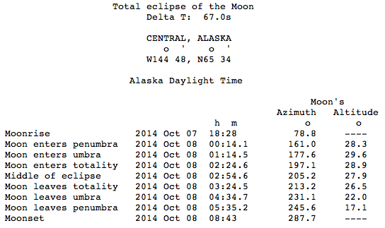 This is the second total lunar eclipse of the moon for 2014 and also the second of a tetrad of total lunar eclipses on April 15, 2014, October 8, 2014, April 4, 2015 and September 28, 2015. The excitement begins (if one can get excited over an eclipse) when the moon enters the umbra at 1:14 am and continues through the umbral, total and second umbral stages. After 4:34 am there's not much to see. The penumbral stages are barely noticeable. Information for Central is given below and information elsewhere may be found using the link below the information for Central.